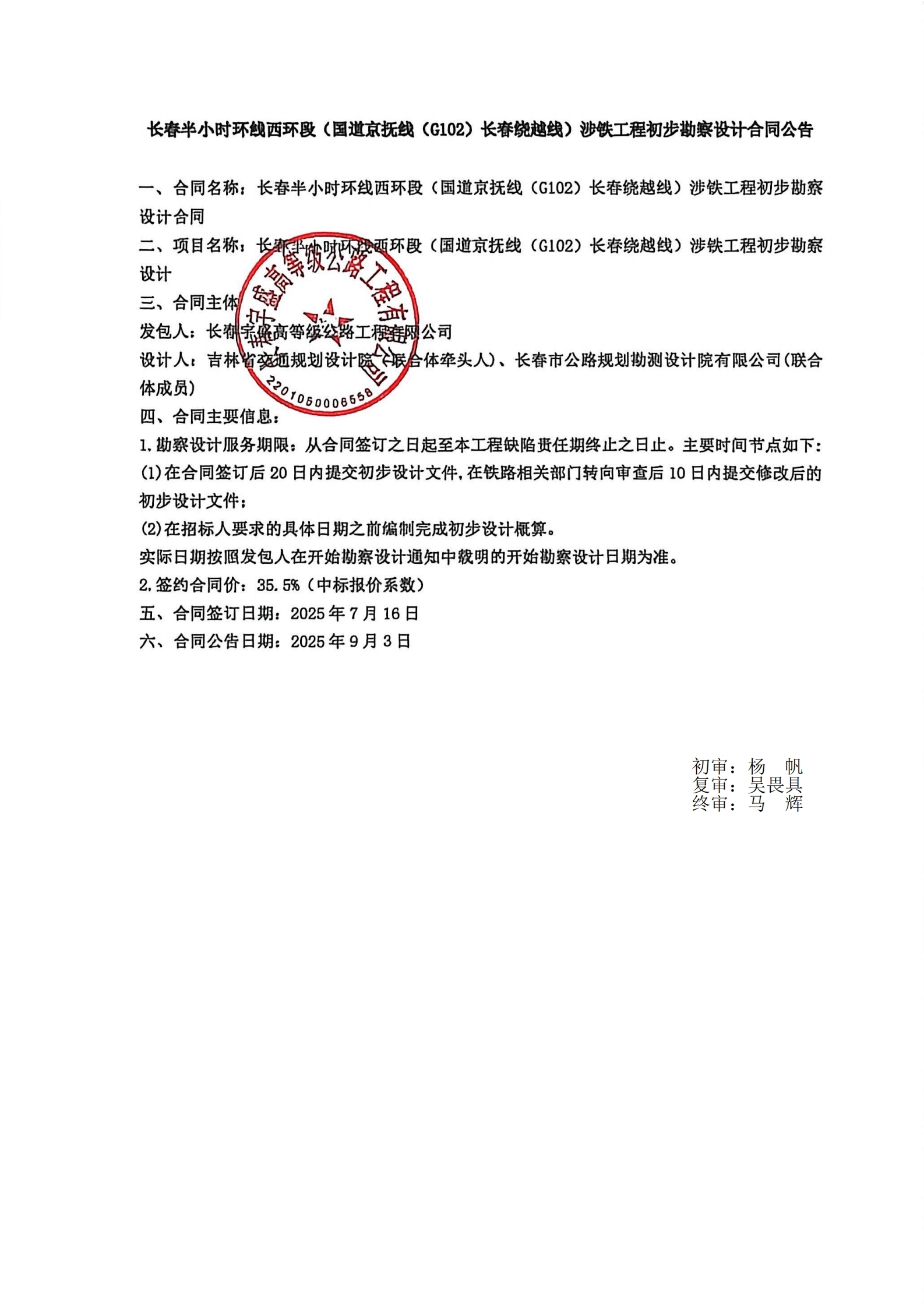 长春半小时环线西环段(国道京抚线(G102)长春绕越线)涉铁工程初步勘察设计合同公告
