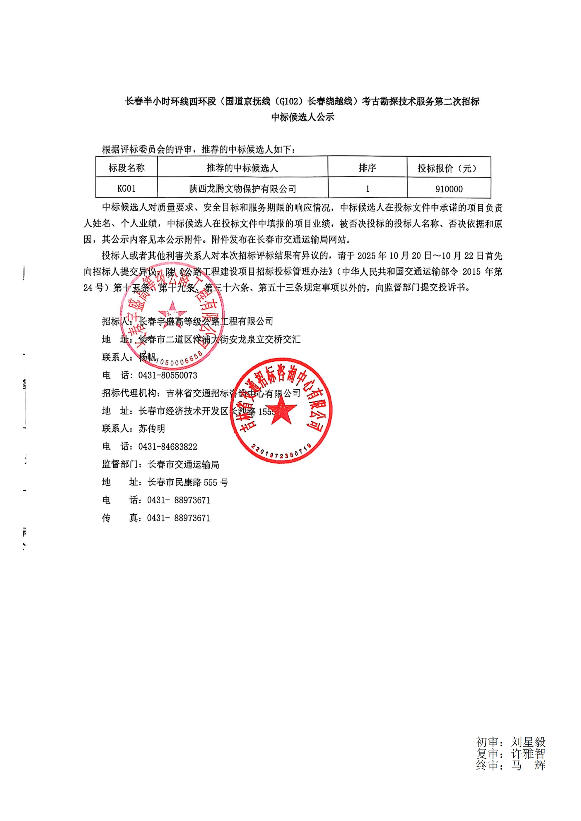 长春半小时环线西环段国道京抚线(G102)长春绕越线考古勘探技术服务第二次招标中标候选人公示