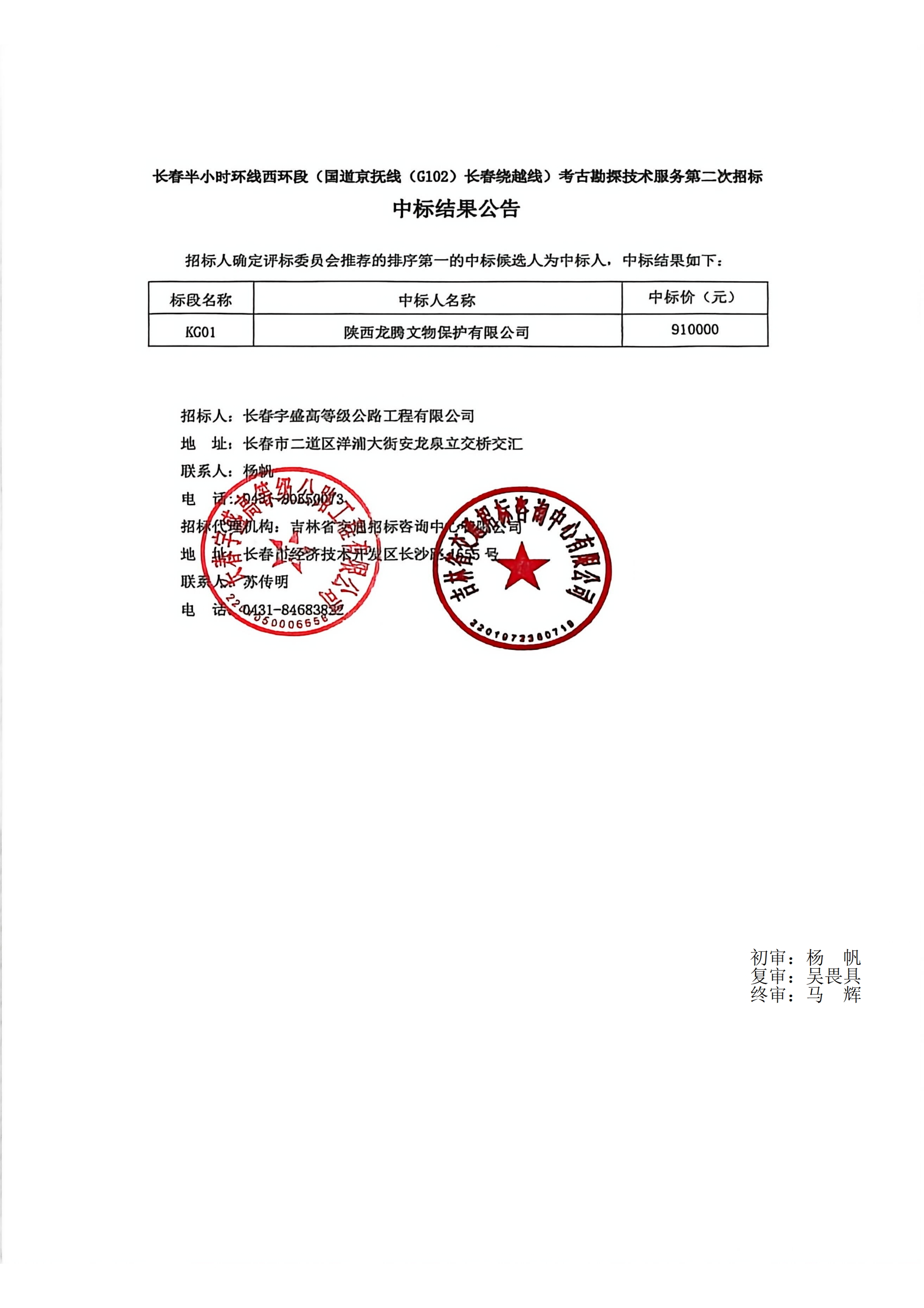 长春半小时环线西环段(国道京抚线(G102)长春绕越线)考古勘探技术服务第二次招标中标结果公告