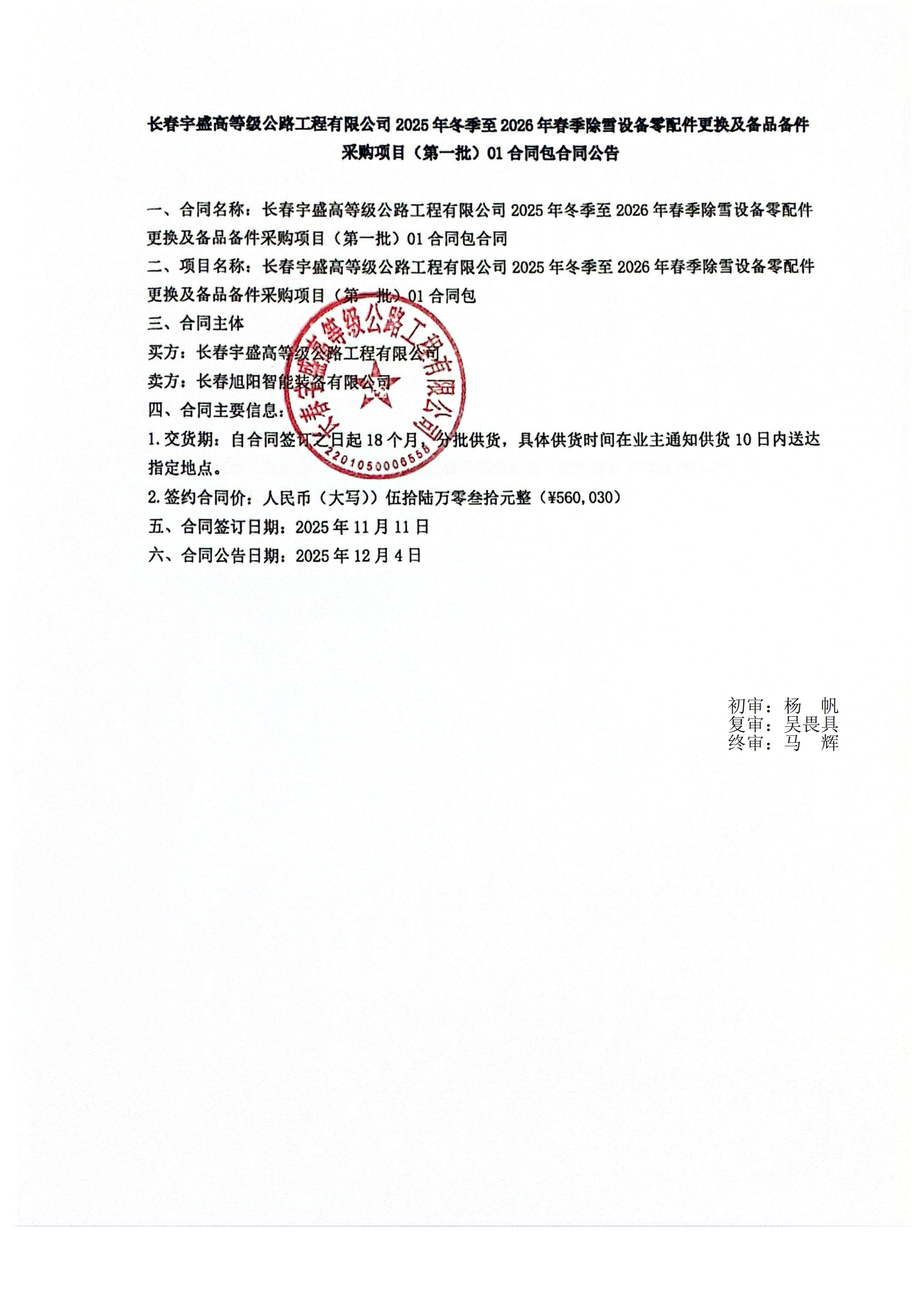 长春宇盛高等级公路工程有限公司2025年冬季至2026年春季除雪设备零配件更换及备品备件采购项目(第一批)01合同包合同公告