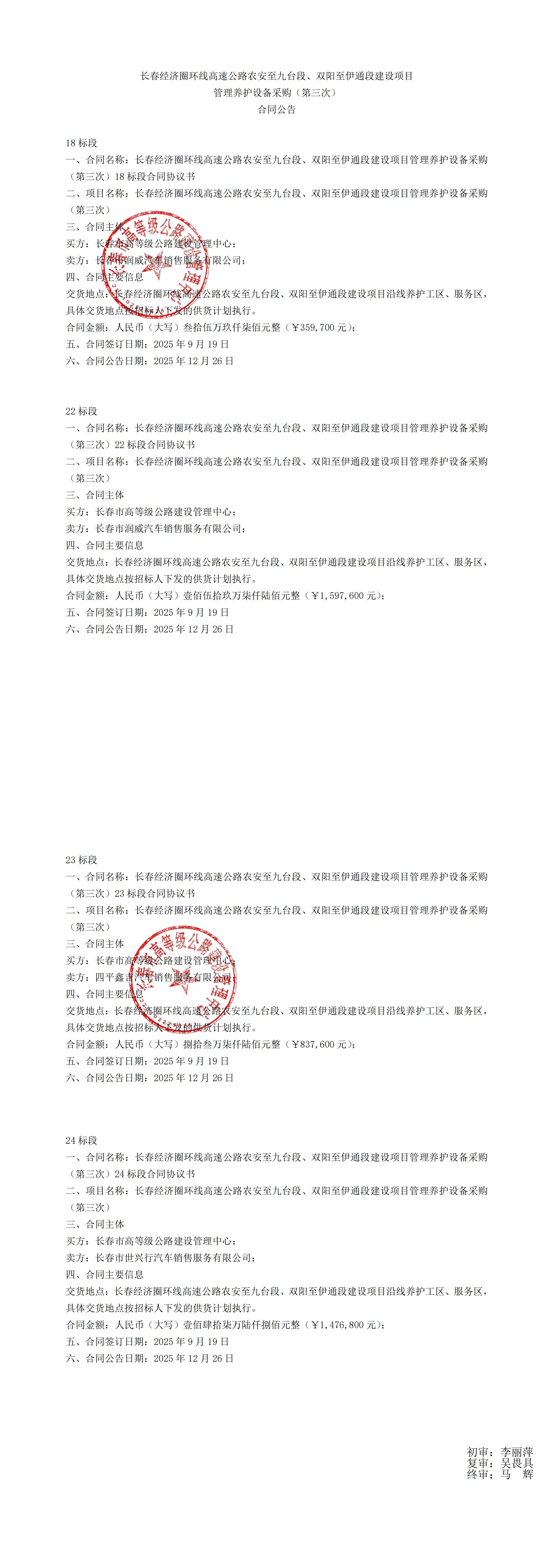 长春经济圈环线高速公路农安至九台段、双阳至伊通段建设项目管理养护设备采购(第三次)合同公告