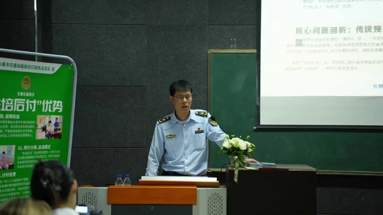 为提升大学生对“先培后付”驾培政策的认知度,筑牢学车权益屏障,助力学子轻松开启驾考之旅,9月28日,长春市交通运输综合行政执法支队主动下沉服务,走进吉林动画学院高新校区,开展了一场以“‘先培后付’进高校 交通护航添保障”为主题的政策宣讲活动,作为“法制护航每一步 文明春城万家行”系列活动之一,此次活动通过政策解读、互动游戏、文艺表演等多元形式,让“先培后付”政策扎根校园,为青春成长系紧了“法制安全带”。